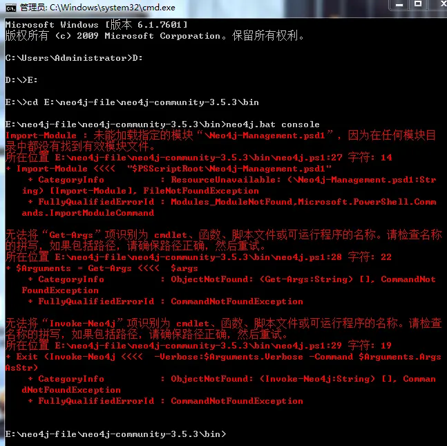 “我的电脑”-“属性”-“高级系统设置”-“环境变量”,将主路径放入系统变量中NEO4J_HOME=E:\neo4j-file\neo4j-community-3.5.3,同时将%NEO4J_HOME%\bin添加到path中,注意英文分号分隔。接着还有错误:Import-Module : 未能加载指定的模块“\Neo4j-Management.psd1”,于是更改