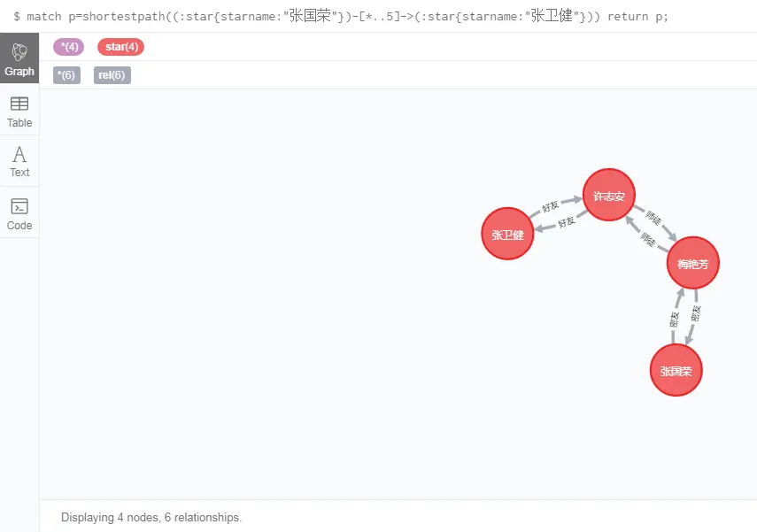 match p=shortestpath((:star{starname:"张国荣"})-[*..5]->(:star{starname:"张卫健"})) return p;
