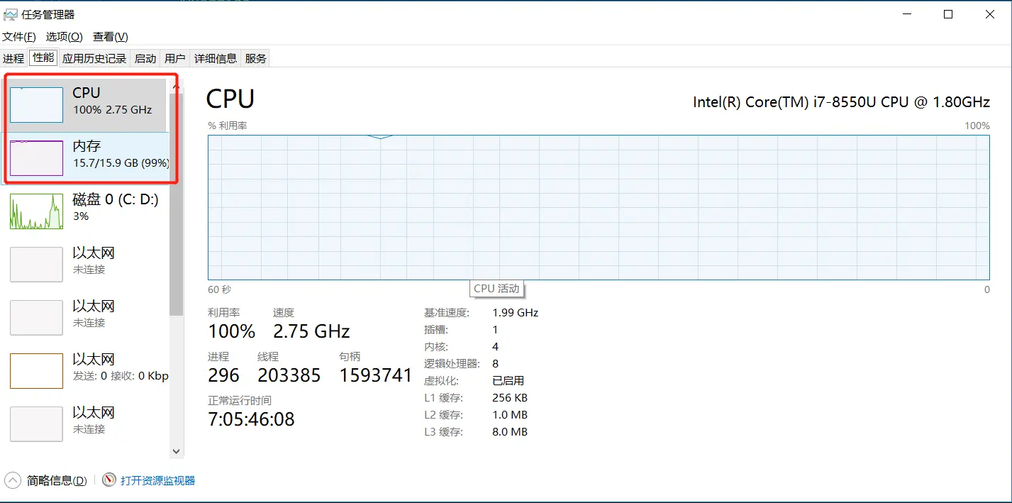 当main方法启动以后,打开控制面板,看到CPU和内存几乎已经全部耗尽: