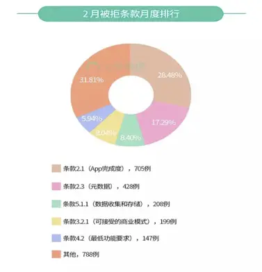 ③而在最近的2月被拒条款排行中,条款 2.1(主要是被拒大礼包),以28.48% 的比例占据了榜首。紧跟其后的是条款2.3(元数据)。新晋条款 4.2(最低功能要求)以147例,5.94% 的比例成为第五名。