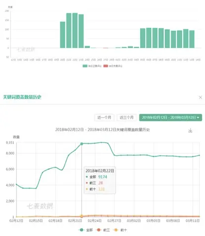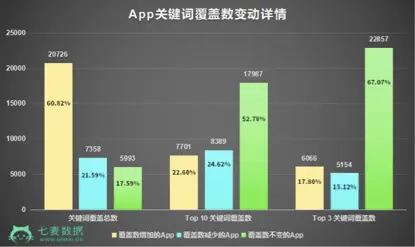 七麦研究院曾对2月22日的所有分类榜31000余款App作为样本进行对比,发现和2月21日相比关键词覆盖数变化率占比在82.41%以上。其中,关键词覆盖数增加的数量比例达60.82%,减少比例为21.59%。