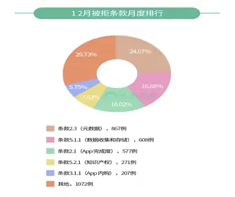 ①如下图所示,2017年12月,在统计的所有样本数据中,条款2.3(元数据问题)占据近乎四分之一的比例;其次是条款5.1.1(主要是用户隐私问题),占比约16.88%;而条款2.1(主要是App完成度问题,此时被拒大礼包还没集中出现)以577例居第三。除此之外,Top5中还有5.2.1。