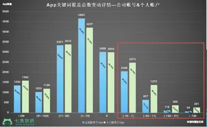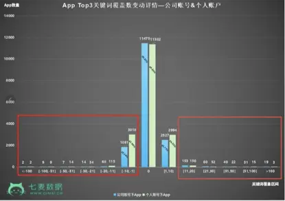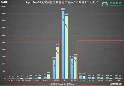 ②从Top3和Top10关键词总数上来看:如果大家觉得上图对比不太明显,可以看下方Top3和Top10关键词覆盖总数变动详情图。减少区间(-1以下)中,个人账号下的App数量和公司账号下的App数量对比,相差很悬殊。
