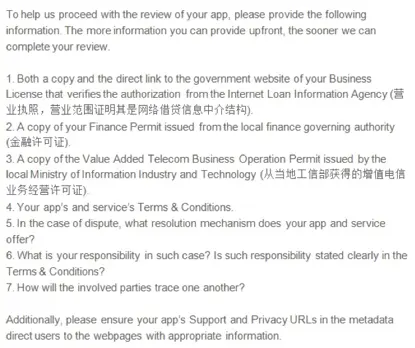 在因3.2.1被拒的App中,很多人是收到了下方的内容,要求提供营业执照、金融许可证等7项内容。对于3.2.1,现在已经出现了待操作、过审,我简单说一下过审的App大体都做了啥吧!