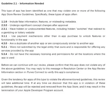 注:2.1刚出现的时,即使App有违规行为直接回复也是有可能过审的,但是目前有点用烂了,苹果那边应该是敏感了,目前过审几率极低,而且有可能被延期。