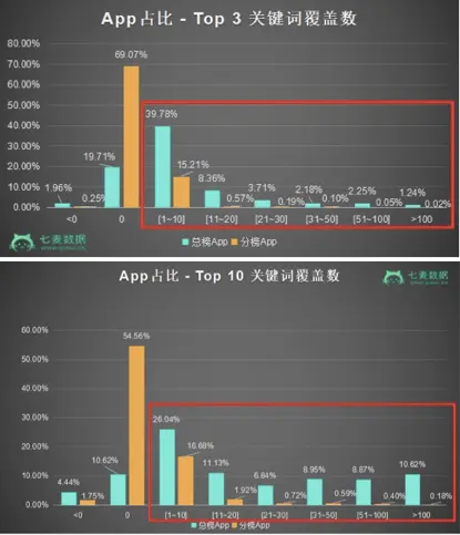 例如,在覆盖总量变化的几个区间中,仅进入分类榜的App关键词覆盖数降低、不变、少量增加(1~10)的比例更多;而总榜App关键词覆盖总量增加超过10以上的App比例呈逐渐增多趋势。