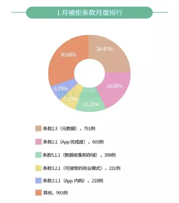 这个现象我们从近3个月被拒条款排行榜即可窥得一斑。当然这里所说的“新的被拒理由”有些是一直存在的,只是没有侧重这方面审核或者说审核没有升级到这一步而已。下面结合数据分析一下,里面会涉及一些被拒现象的分析。