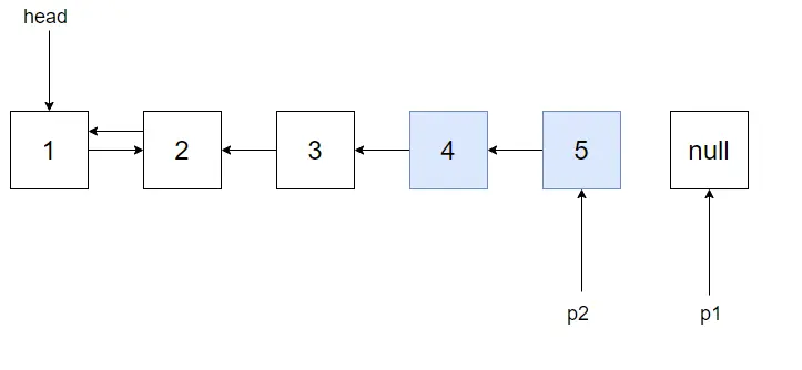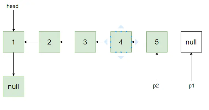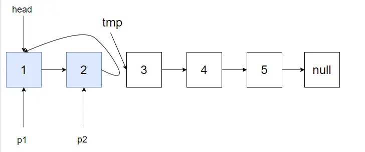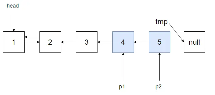 然后将p1,p2往前挪动,当然还有tmp,直到p2为空,这时p1指向反转后链表的头结点。
