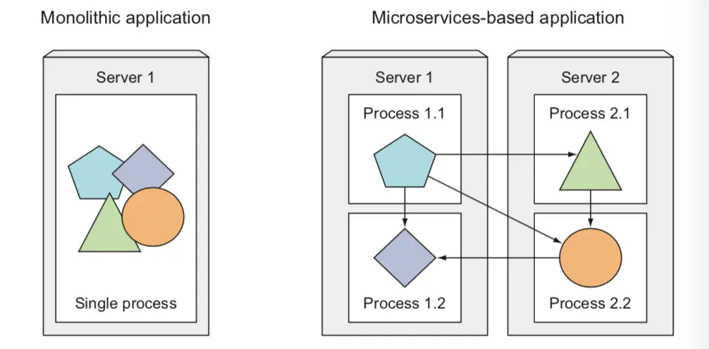 每个微服务都是独立的进程,通过定义好的接口(restful api ,amqp)互相调用