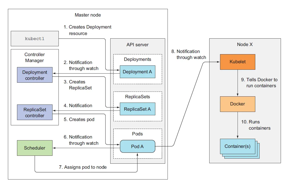 就像rc并不是直接控制pod一样,deployment也是类似,deployment声明式的通知api server 需要升级后的结果,具体升级的逻辑由development controller去处理