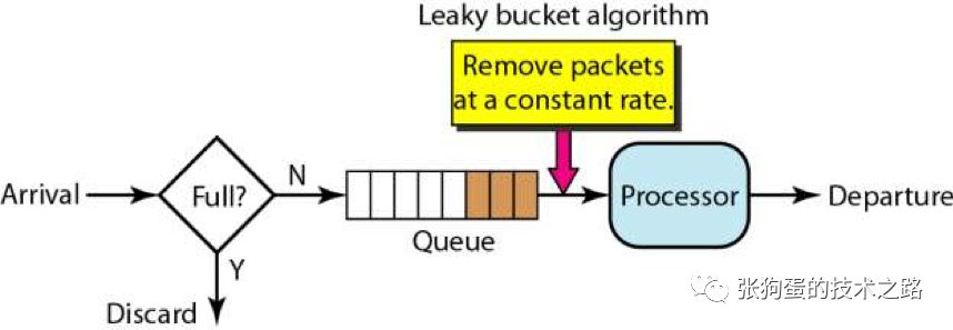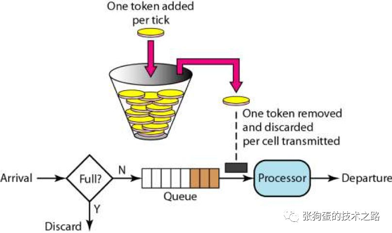 漏桶算法的实现往往依赖于队列,请求到达如果队列未满则直接放入队列,然后有一个处理器按照固定频率从队列头取出请求进行处理。如果请求量大,则会导致队列满,那么新来的请求就会被抛弃。