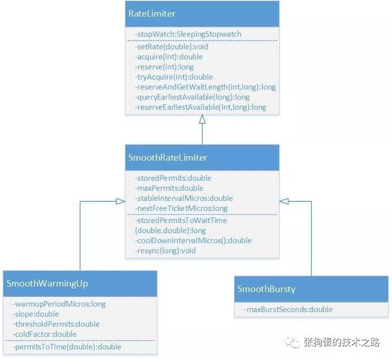 RateLimiter的类图如上所示,其中 RateLimiter是入口类,它提供了两套工厂方法来创建出两个子类。这很符合《Effective Java》中的用静态工厂方法代替构造函数的建议,毕竟该书的作者也正是Guava库的主要维护者,二者配合"食用"更佳。