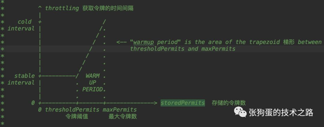 * 每秒增加的令牌数为 warmup时间/maxPermits. 这样的话,在warmuptime时间内,就就增张的令牌数量