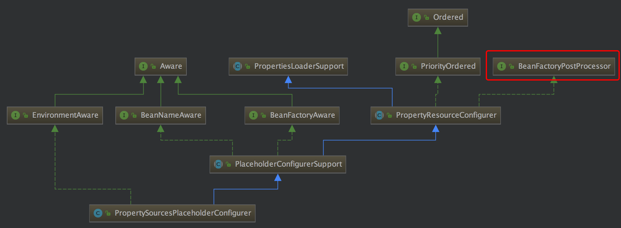 当BeanFactory在第一阶段加载完成所有配置信息时,保存的对象的属性信息还只是以占位符的形式存在.这个解析的工作是在PropertySourcesPlaceholderConfigurer中做的,我们来看看继承体系图就明白了.