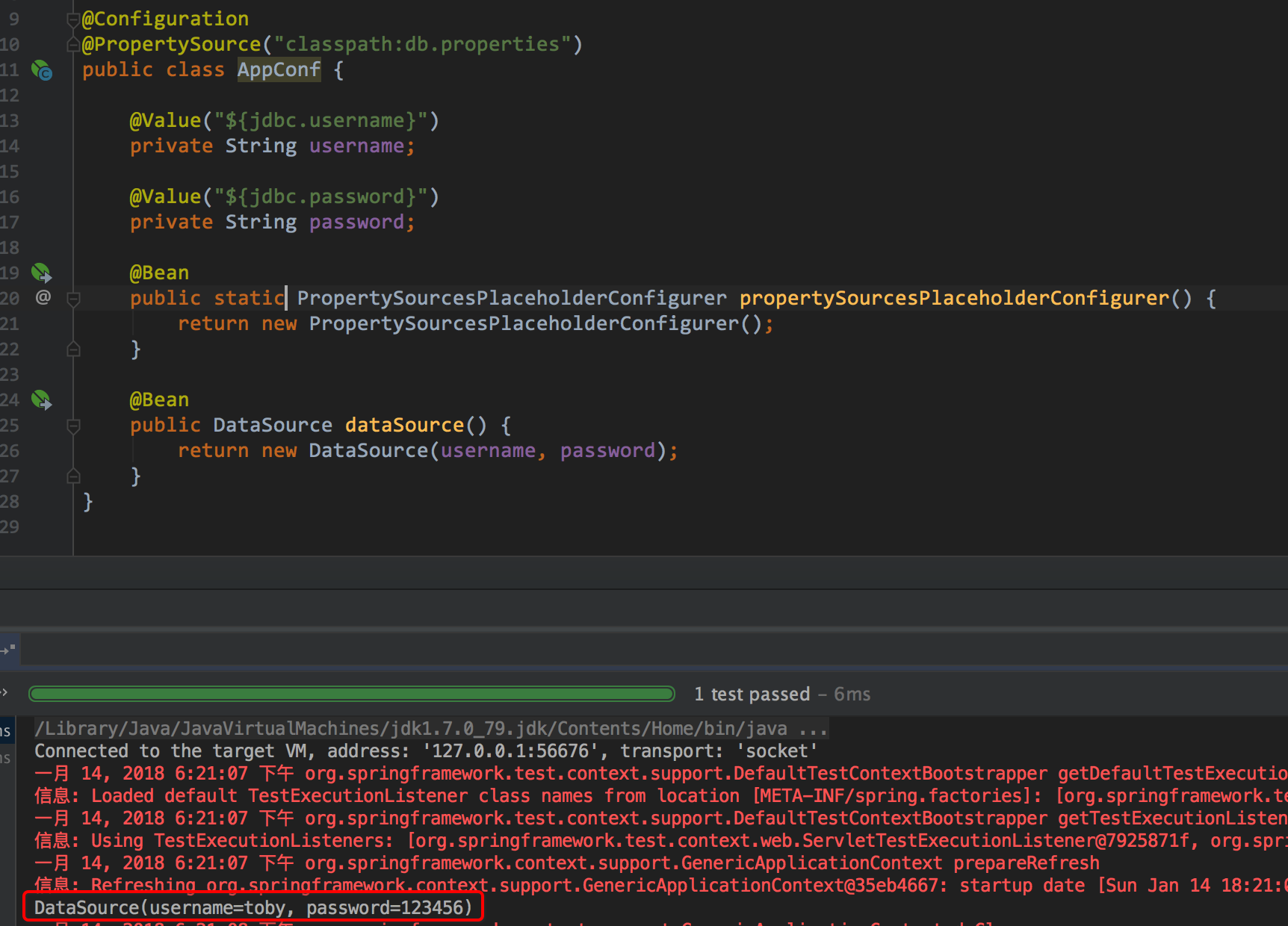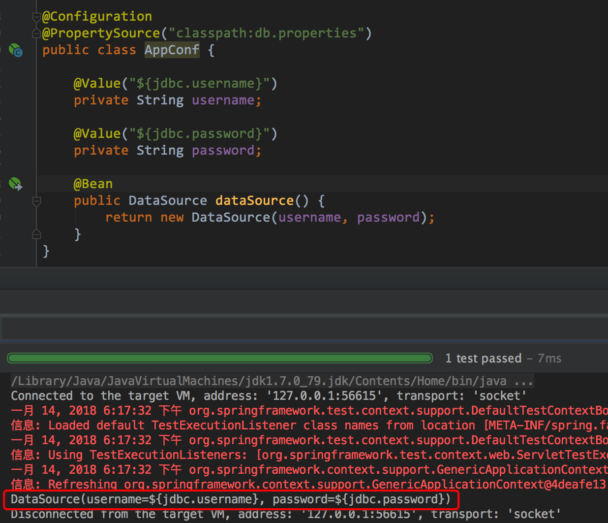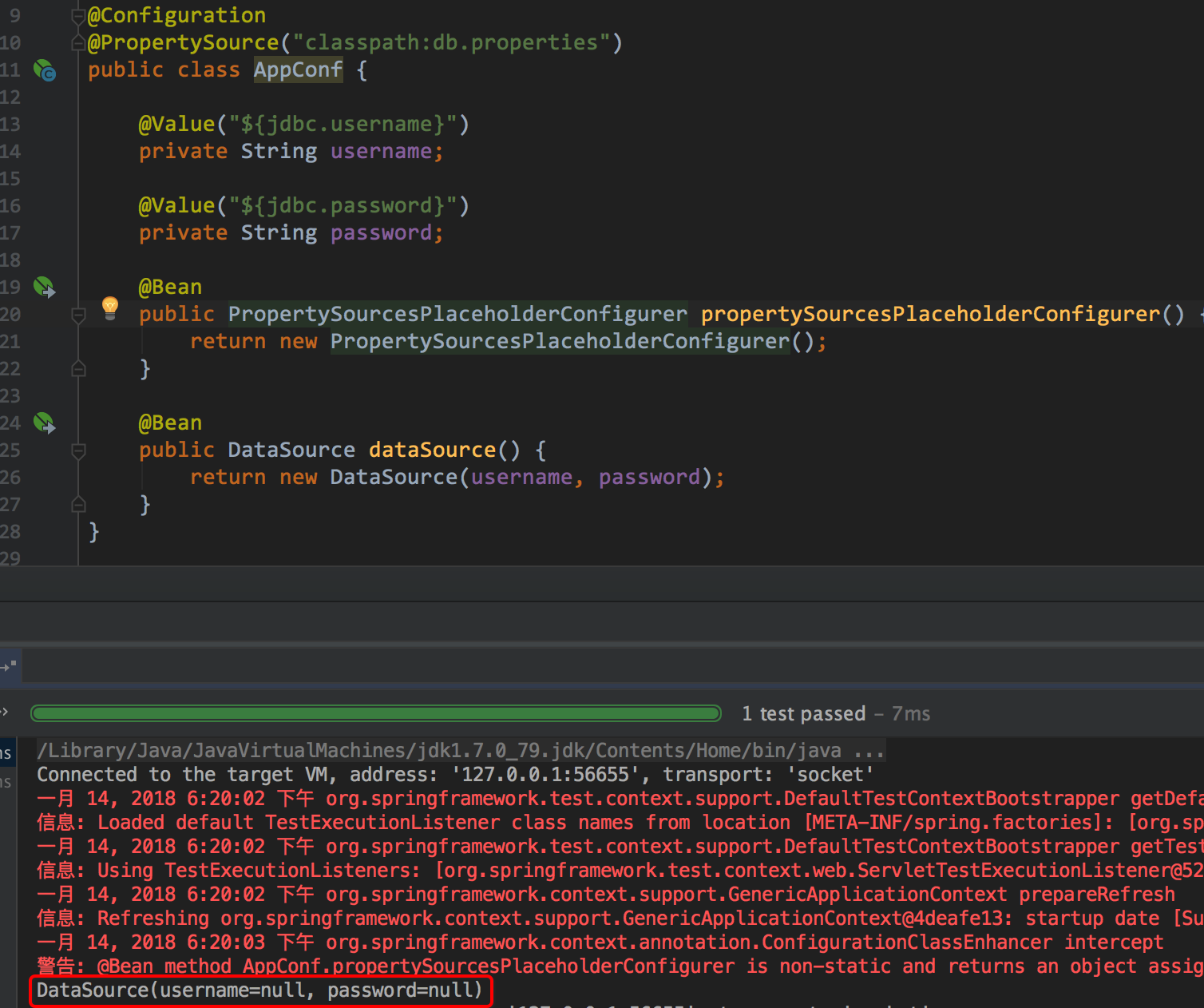 于是你高高兴兴补上了PropertySourcesPlaceholderConfigurer,发现有坑,占位符是解析出来了,但是却是null