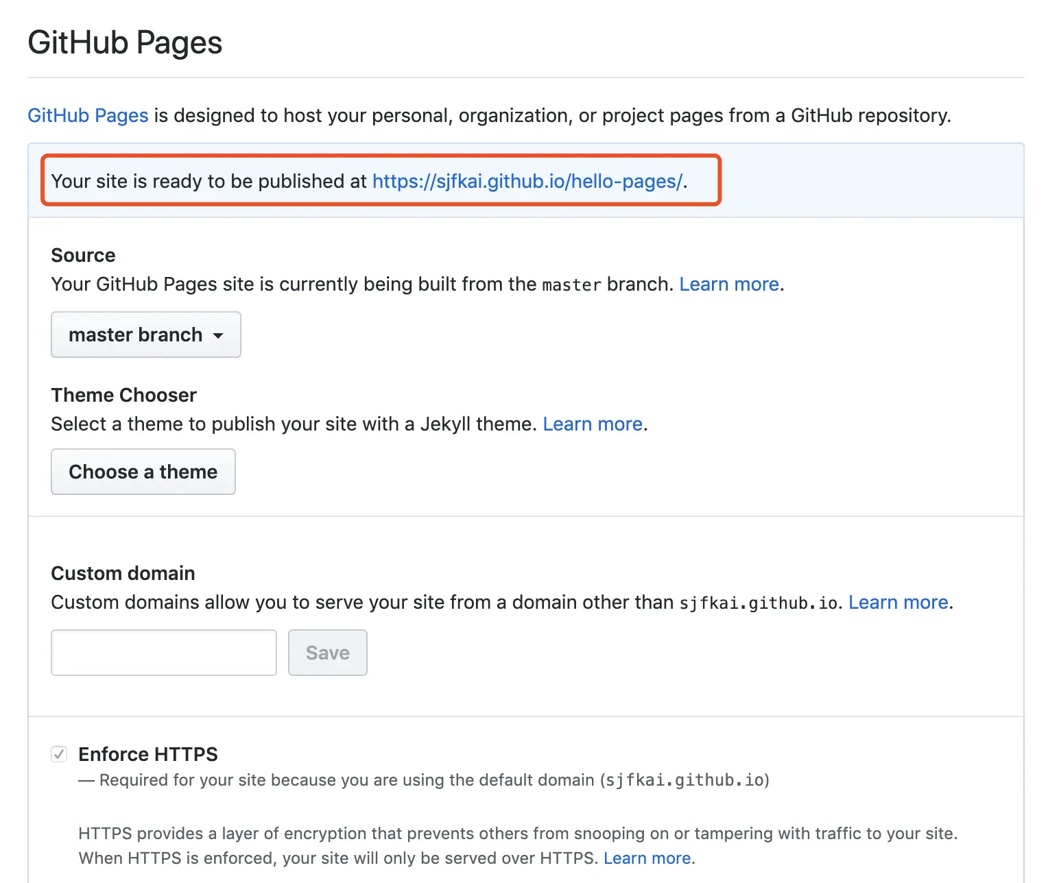 在 github hello-pages 项目页面点击 Setting,向下找到 GitHub Pages 勾选 Enforce HTTPS