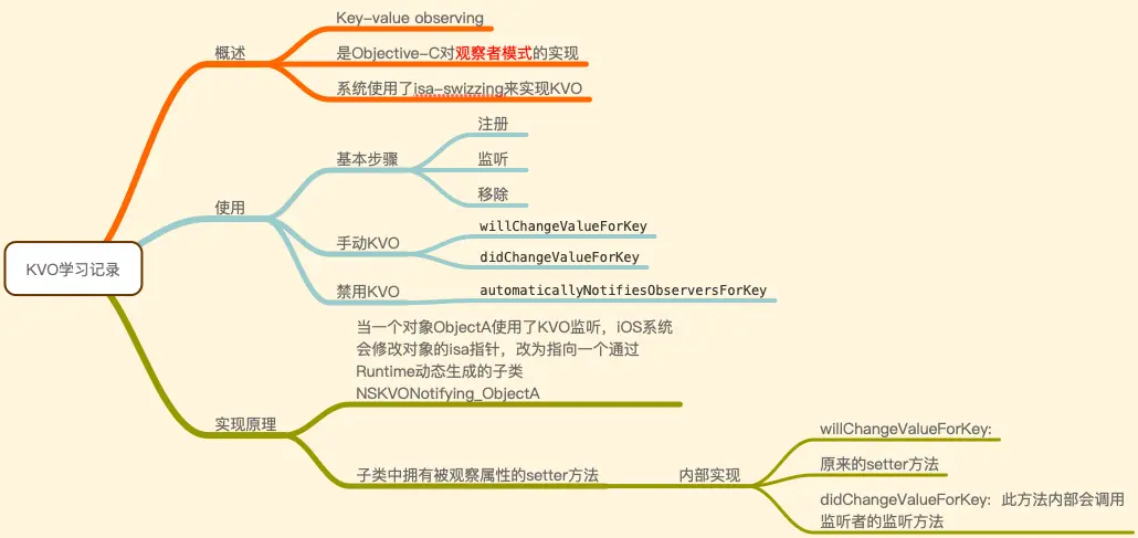 - 重写了被观察属性setter方法,set方法实现内部会顺序调用 willChangeValueForKey 方法、原来的 setter 方法实现、didChangeValueForKey 方法,而 didChangeValueForKey 方法内部又会调用监听器的 observeValueForKeyPath:ofObject:change:context: 监听方法。。