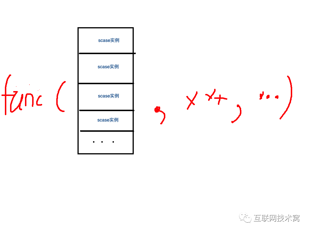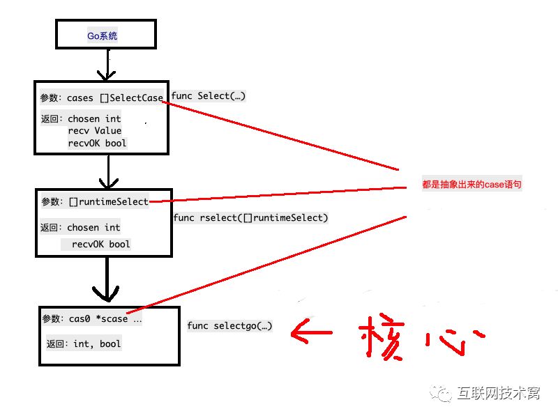 这仨函数中无论是返回值还是参数都大同小异,可以简单粗暴的认为:函数参数传入的是case语句,返回值返回被选中的case语句。 那谁调用了 funcSelect(cases[]SelectCase)(chosenint,recvValue,recvOKbool)呢? 可以简单的认为是系统了。 来个简单的图: