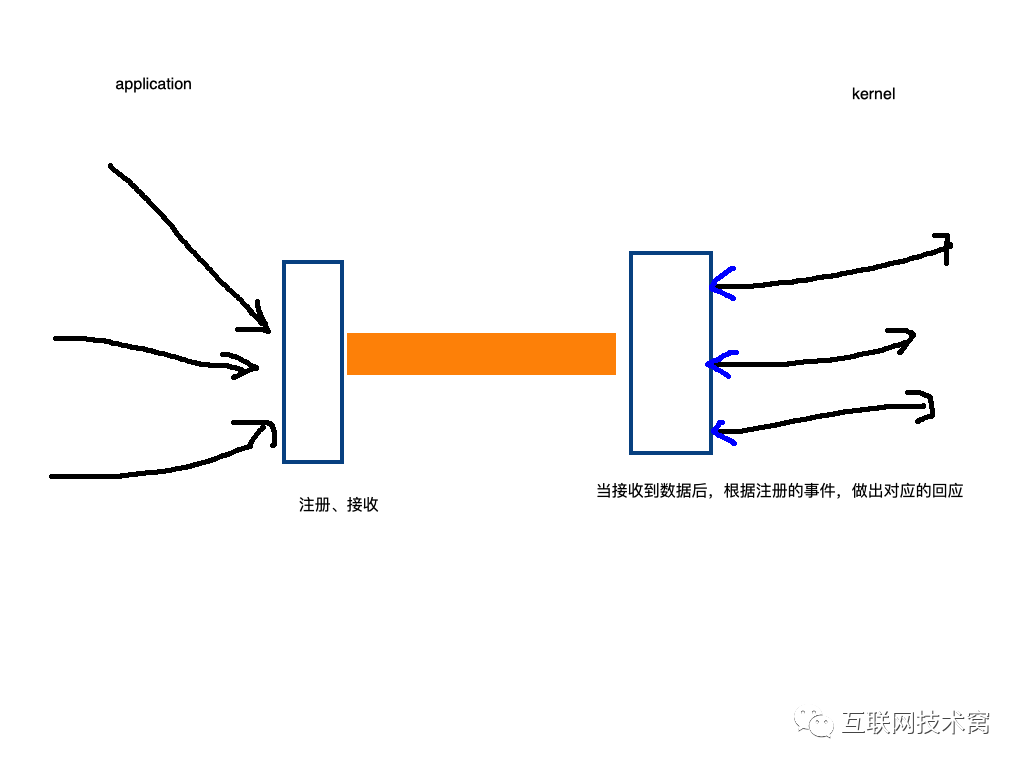 每个线程或者进程都先到图中”装置“中注册,然后阻塞,然后只有一个线程在”运输“,当注册的线程或者进程准备好数据后,”装置“会根据注册的信息得到相应的数据。从始至终kernel只会使用图中这个黄黄的线程,无需再对额外的线程或者进程进行管理,提升了效率。