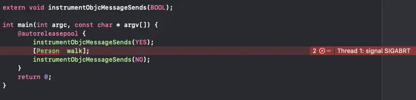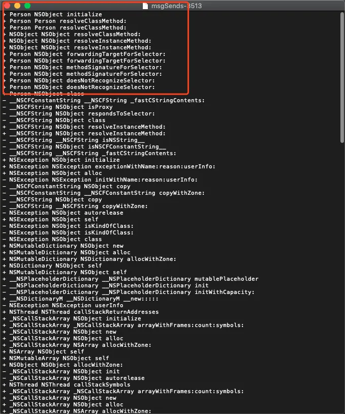 这个函数可以进行打印信息比如打印一些底层log,这些信息最终会储存到一些地方地址是**./private/tmp** 目录,可以通过这些函数查看底层调用了那些信息那么怎么使用这个函数呢。 定义一个Person类 定义一个walk方法,注意之前一定要写上instrumentObjcMessageSends(YES) 和 instrumentObjcMessageSends(NO)方法
