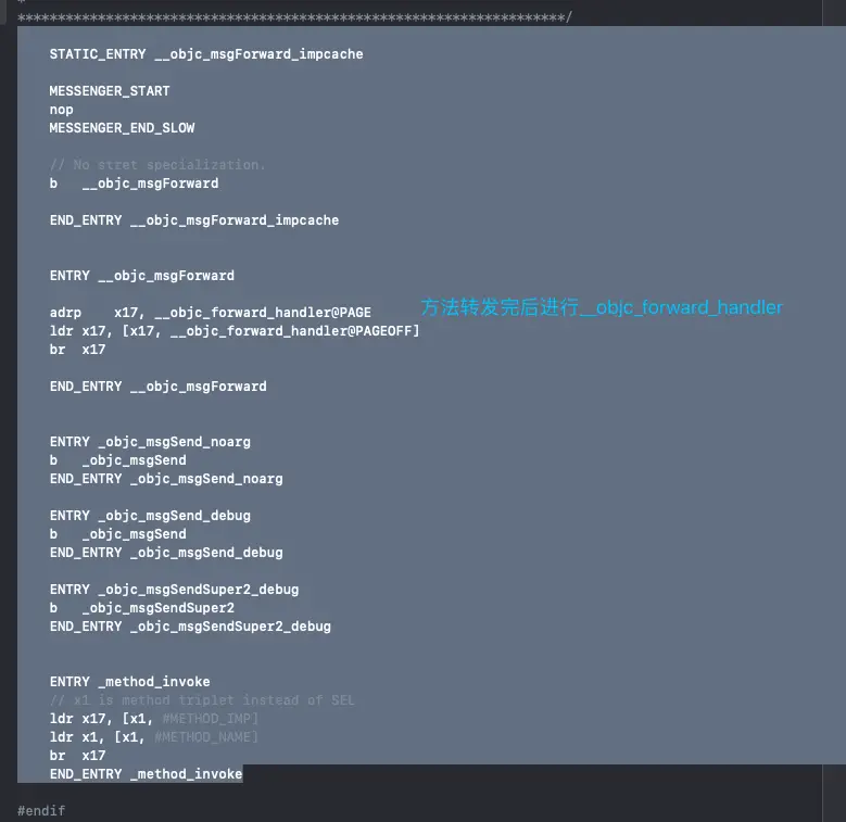 上面的动态方法解析如果没有拦截则会进入__objc_msgForward_impcache这个方法,这个方法是由汇编进行调用的,没有源码实现。源码实现是闭源的。大家都知道没有拦截会进行快速转发forwardTarget,然后快速转发会通过methodSginatureForSelector进行方法签名慢速转发.,我们要分析的肯定不能这么肤浅需要更深层次的来进行解析