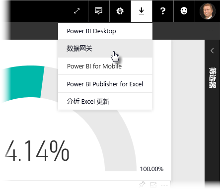 用于将本地数据源连接到 Power BI 服务的系统称为数据网关。它是在计算机上运行的小型应用程序,按预先安排的计划来连接数据、收集任何更新并将其推送到 Power BI 服务。个人网关是数据网关的一个版本,可在没有任何管理员配置的情况下使用。要设置个人网关,请首先登录到 Power BI 服务。选择屏幕右上角的下载图标,然后从菜单中选择“数据网关”。