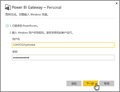 网关服务在你的帐户中运行,因此,系统将首先要求你登录 Power BI 服务帐户,然后登录计算机的 Windows 帐户。