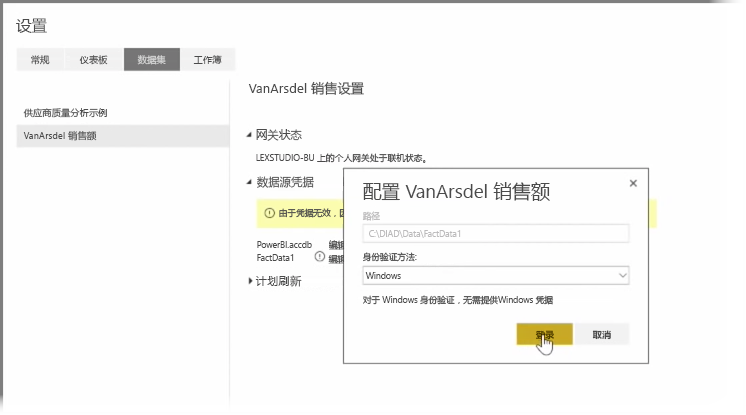返回到 Power BI 服务。选择你要刷新的数据集旁边的省略号(三个点),然后选择计划刷新。这将打开刷新设置页。Power BI 检测到你已安装个人网关,并告知你它的状态。然后选择每个适用数据源旁边的编辑凭据并设置身份验证。