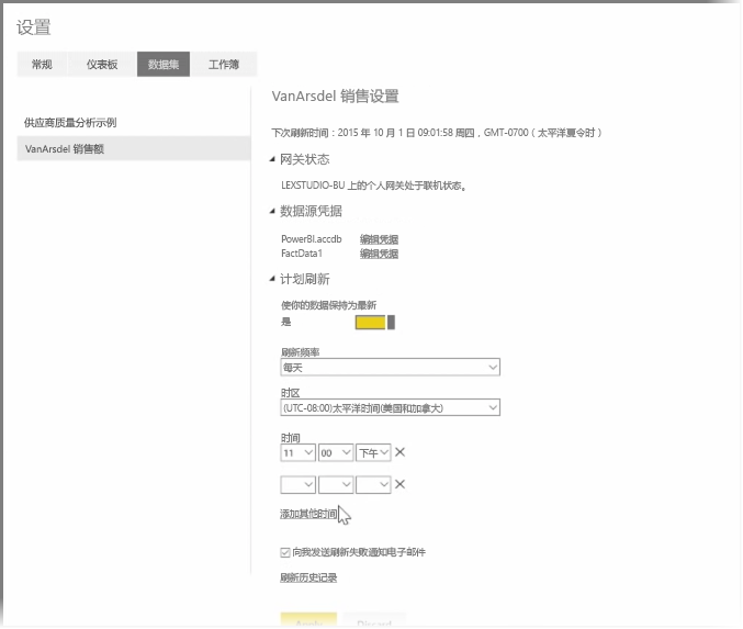在计划的时间,Power BI 将使用你提供的凭据和对运行着你的个人网关的计算机的连接进入这些数据源,并按照你的计划更新报表和数据集。 在你下次转到 Power BI 时,这些仪表板、报表和数据集将反映截至最近计划刷新的数据。