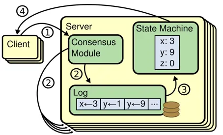 共识算法有一个很典型的应用场景就是复制状态机。Client 向复制状态机发送一系列能够在状态机上执行的命令,共识算法负责将这些命令以 Log 的形式复制给其他的状态机,这样不同的状态机只要按照完全一样的顺序来执行这些命令,就能得到一样的输出结果。所以这就需要利用共识算法保证被复制日志的内容和顺序一致。