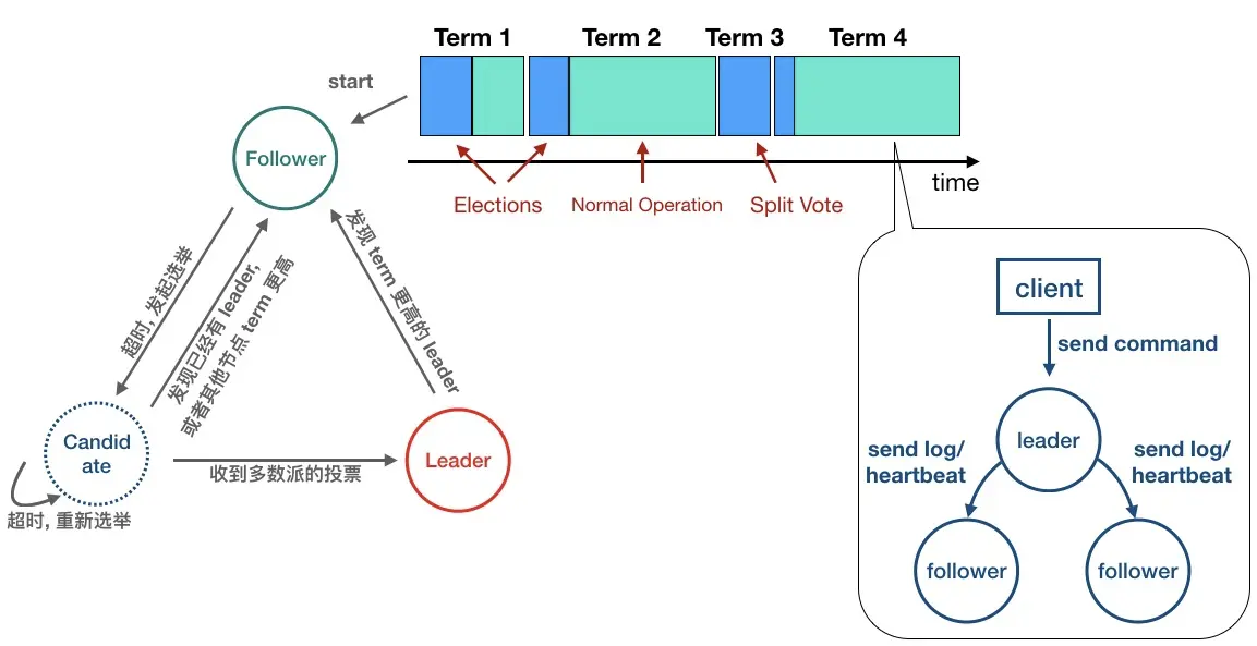 当然了,当一个 Leader 发现有 Term 更高的 Leader 时也会退回到 Follower 状态。