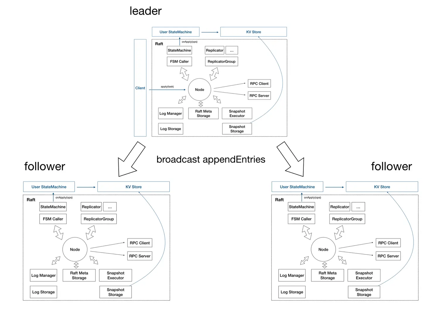 刚才我们说的是一个节点内部的情况,那在 Raft Group 中至少需要 3 个节点,所以这是一个三副本的架构图。