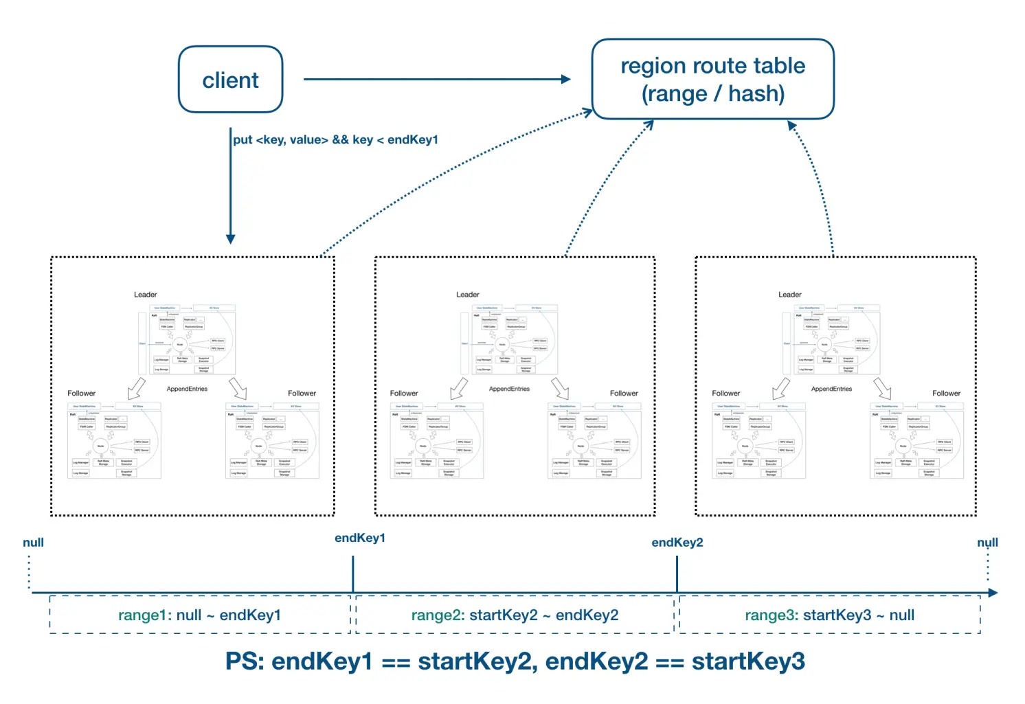 我们会因为各种各样的需求而去构建一个 Raft 集群,如果你的目标是实现一个存储系统的话,那单个 Raft 集群可能没有办法承载你所有的存储需求;如果你的目标是实现一个为用户请求提供 Service 的系统的话,因为 Raft 集群内只有 Leader 提供读写服务,所以读写也会形成单点的瓶颈。因此为了支持水平扩展,SOFAJRaft 提供了 Multi-Group 部署模式。如图所示,我们可以按某种 Key 进行分片部署,比如用户 ID,我们让 Group 1 对 [0, 10000) 的 ID 提供服务,让 Group 2 对 [10000, 20000) 的 ID 提供服务,以此类推。