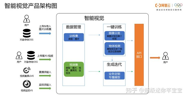 智能视觉整体的产品架构是:用户通过对象存储OSS导入或本地上传图片训练集,对图像及图像内物体进行标签管理,实现一键训练(目前已经支持图像分类和物体检测),标注好之后一键生成迭代,生成业务定制专属模型,并可以通过迭代来不断完善模型的准召率、精准度,最终以API的形式将模型训练能力快速输出应用于业务之中,同时支持对图片、视频、直播流、监控流等多种格式的预测。