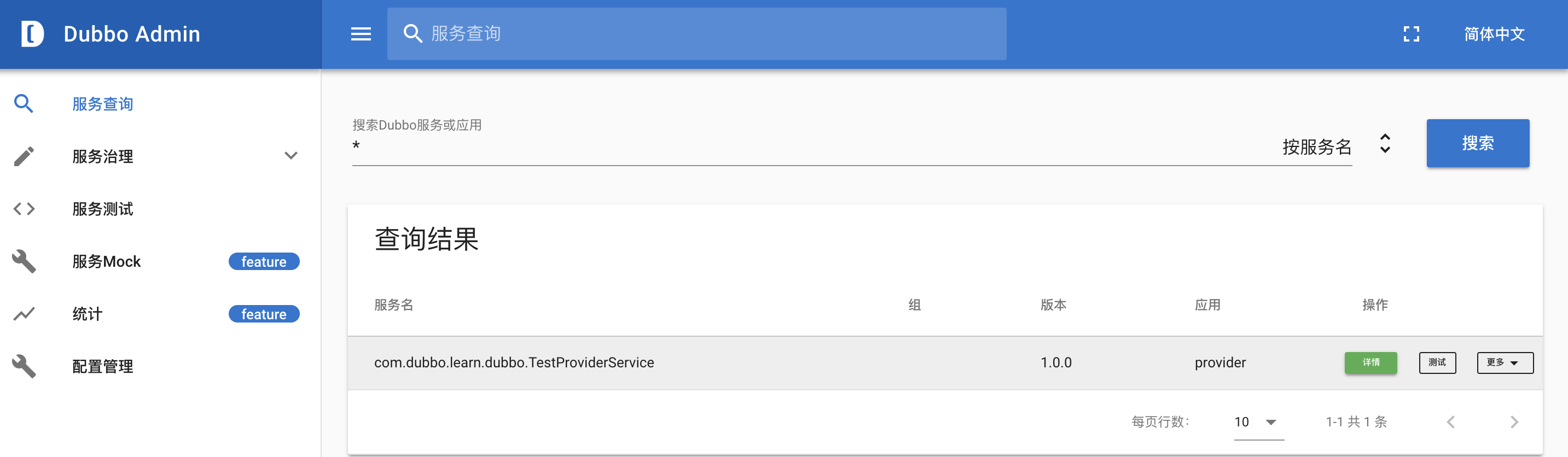 启动之后,通过 dubbo Admin 网页客户端可以看见Provider的接口在 Regitry 里面注册成功。