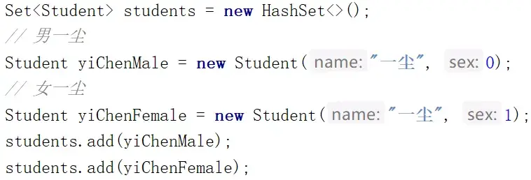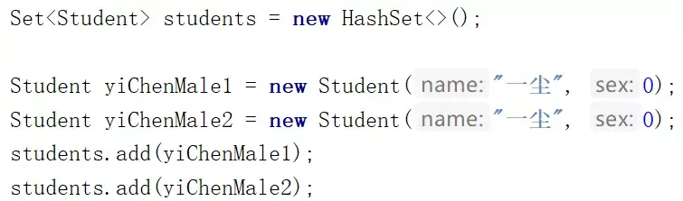 两个名字和性别都一样的学生,按理来说应该是同一个人了(逻辑上一样),但是它的 set 集合输出却有两个一尘,都是男的,没有去重。