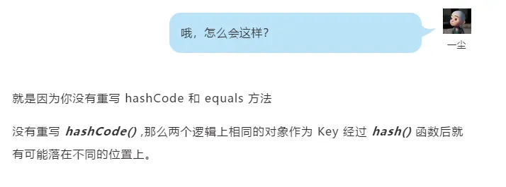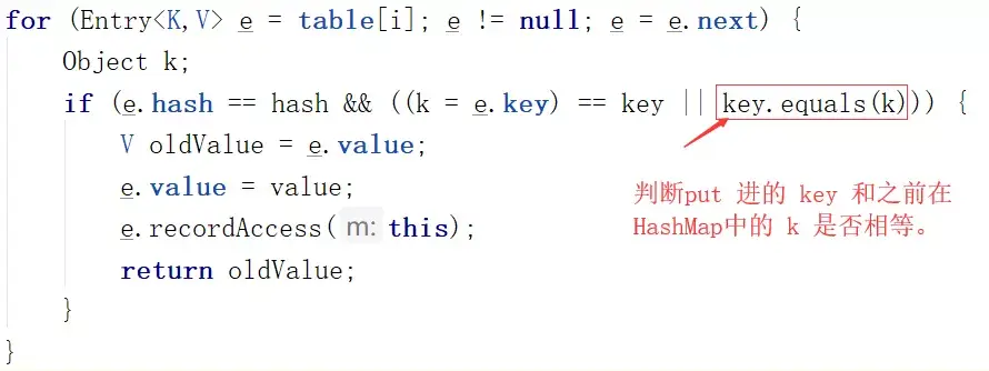 这里可以看到,就算你的两个对象的hashCode一样(e.hash==hash),落在了同一个位置(桶),但是如果你不重写equals方法,那么在判断HashMap集合里是否存在相同的元素的时候,就会根据Object的equals方法来判断。