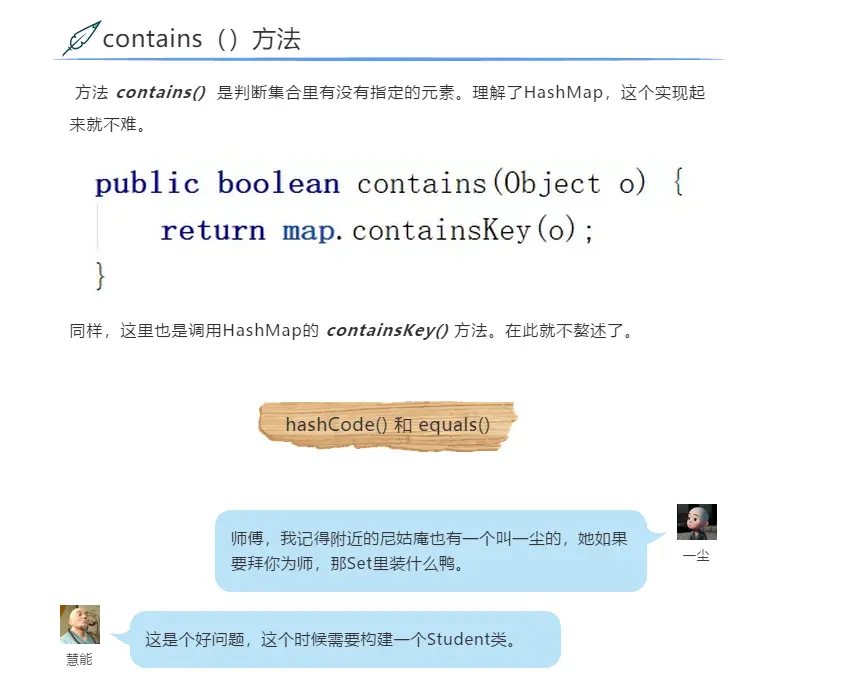 到时候每查一个人,你只需要判断它在没在集合里,你可以用 contains() 来判断。