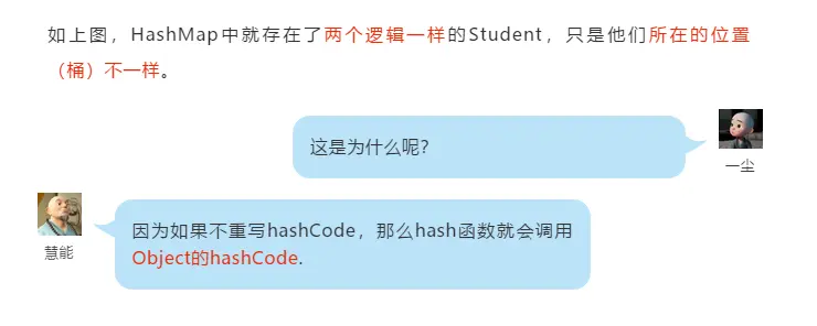 你上面new的两个Student虽然逻辑上一样,但是两个对象的地址不一样,所以它们的hashCode可能会根据地址来计算,就会产生不同的hashCode,从而落在了不同的位置(桶)中了。