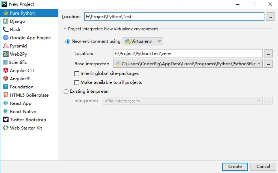 左侧提供了很多的模板工程,默认创建的是Pure Python(纯Python),右侧选择工程保存的路径和工程名就好,下面的这个irtualenv上一节说到的虚拟环境,点击「Create」创建即可。