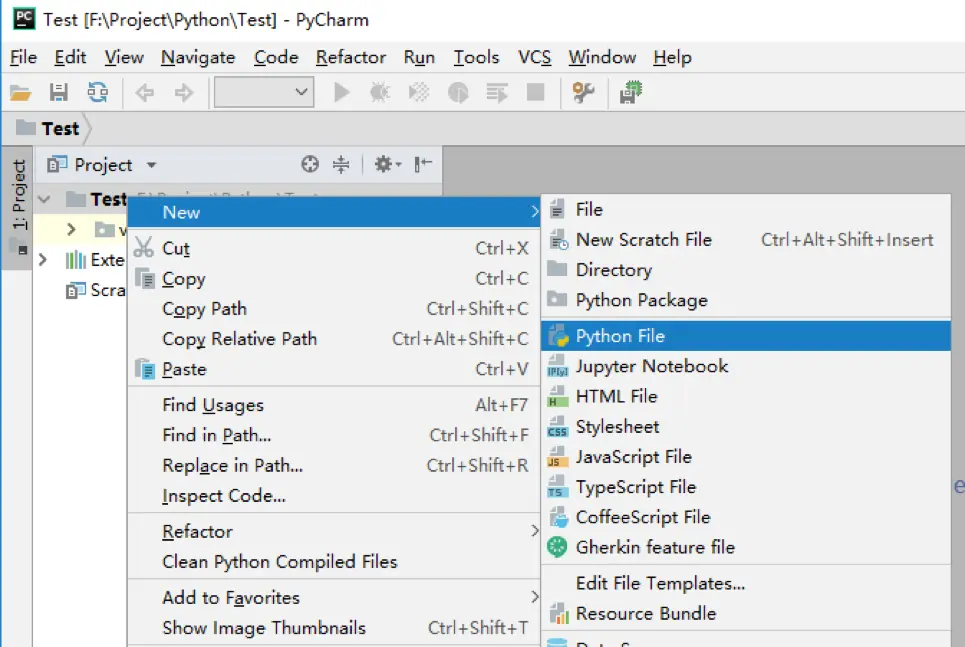 点击工程,右键,点击「New」,然后点击「Python File」。