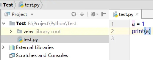 在左侧双击打开创建的test.py文件,在右侧即可进行代码编写,这里写了一个最简单的程序, 定义一个变量a,赋值1,然后把a打印出来!