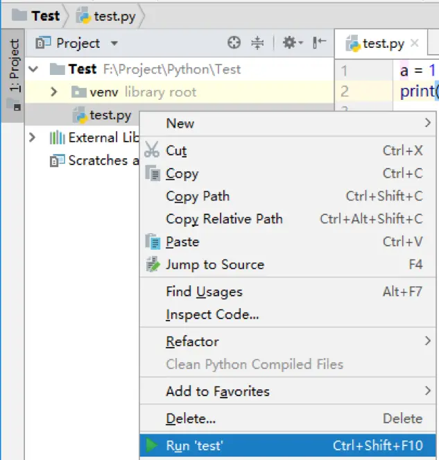 右键程序,找到:Run 'test',即可运行程序,当然你也可以直接按快捷键。