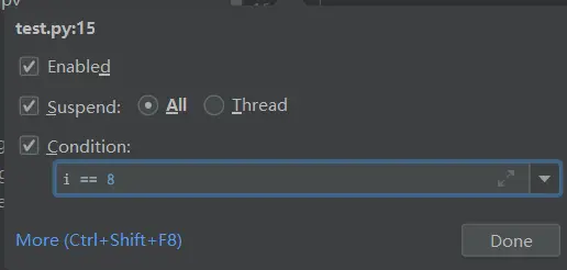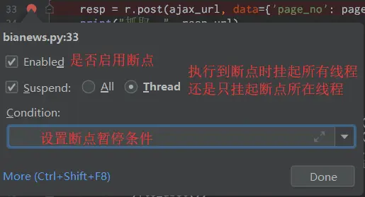 对「特定行进行调试」时用到,点击行所在的左侧边栏即可设置。 右键点击这个断点,会弹出如下所示的设置对话框: