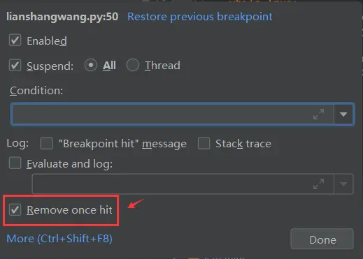 鼠标点击后可以去掉临时断点,如果想把临时断点变成普通断点,可以取消勾选「Remove once hit」的选项。