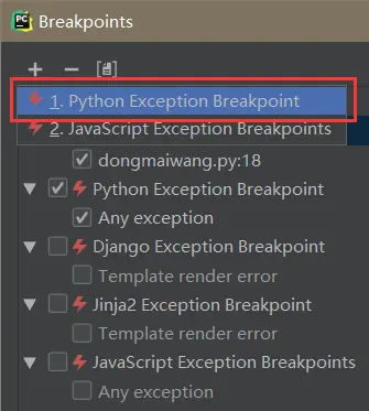 这个小红点就是断点,在PyCharm中,有着各种类型的断点: