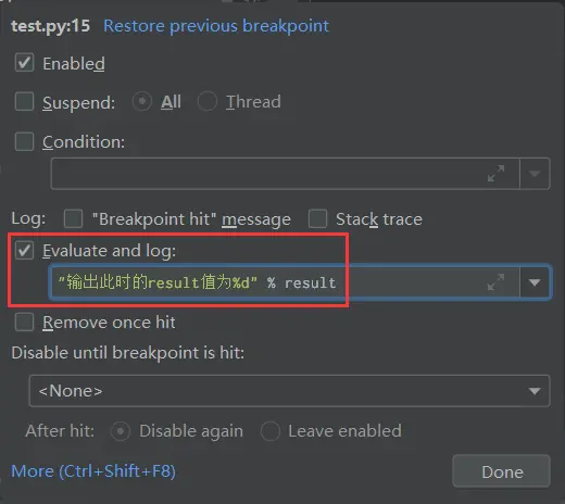 调试的时候我们可以通过打印日志的方式来定位异常代码大概位置,以缩小引发问题的范围,然后再使用断点精确定位问题。如果是普通的打印日志,我们需要等待重新构建程序,如果用「日志断点」就避免这个无意义的等待。使用日志断点非常简单,右键断点,去掉「Suspend」的勾选,会出现如下所示的弹窗,勾选「Evaluate and log」在此输入想输出的内容。
