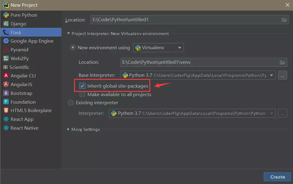 其实可以让当前项目和全局的Python解释器共用。在创建项目的时候勾选:「inherit global stie-packages」即可,如图所示: