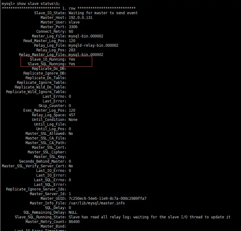 看到图中的两个yes,就表示我们的从服务器已经在完全运行了。