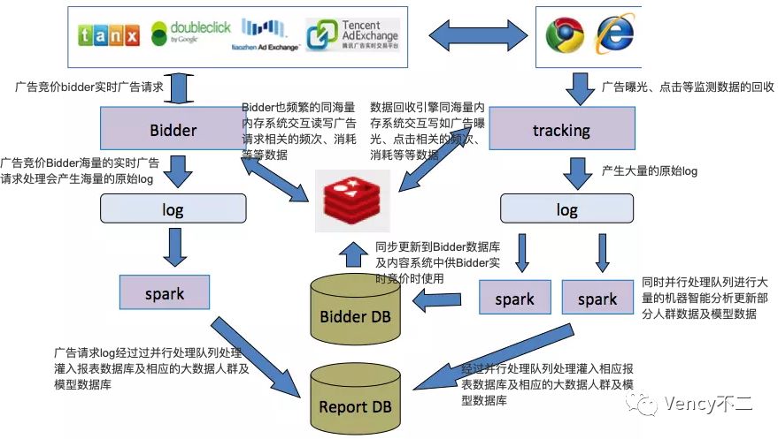 上图中可以看到两条处理线,一条是广告竞价请求(投放日志)的处理,另一条是广告曝光、点击等监测数据(跟踪日志)的处理。具体可看我在图上的说明。